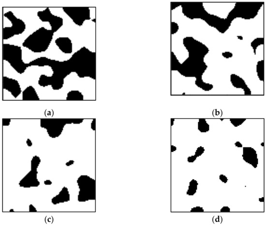 A Gaussian convolution is applied to the defined kernel and the random image previously generated. The result is a normally distributed image that is converted to a uniform (flat) distribution. Therefore, the resulting image can be defined as a gray-scale matrix . The solid–pore interface is set up by defining an edge level value, ψ0, which falls in the 0 to 1 range. All pixel values in the last resulting image greater than the edge level are rounded to the value one and defined as the solid phase; otherwise, a value of 0 is set and defined as the pore phase, producing a set of binary values as in Carvalho et al. [32].