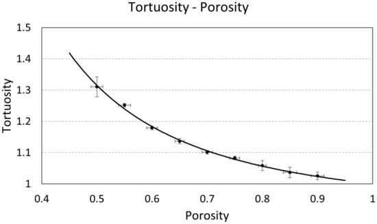 Figure 10 shows the obtained results that consider the range of porosity analyzed. It is crucial to notice that the proposed correlation describes the geometric tortuosity for porosities between 0.50 and 0.90. Figure 10 shows the selected correlation and the average values for each porosity and their corresponding deviation errors.