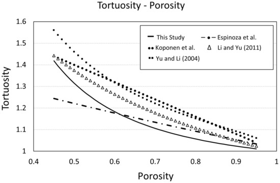 Table 2 is a collection of theoretical and empirical tortuosity–porosity correlations that satisfy the three requirements for tortuosity τ [40]. These are: