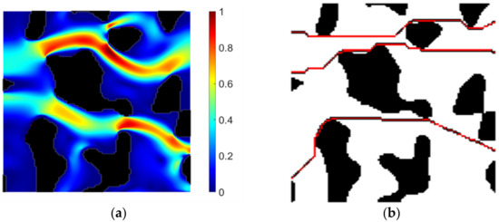 First, the velocity field over the void spaces was computed following Equation (10). Then, the hydraulic tortuosity was determined. A MATLAB script simulating the lattice Boltzmann method was used to compute the hydraulic tortuosity. At the same time, the geometric tortuosity was calculated considering the A-star algorithm proposed in this study by using Equation (7). The results revealed that the hydraulic tortuosity was 𝜏ℎ = 1.1768, and the geometric tortuosity computed using the A-star algorithm was 𝜏g = 1.1342. Thus, the geometric tortuosity is smaller than the hydraulic tortuosity by around 3.7%. Figure 12a shows the fluid’s velocity field through the selected porous domain, where the red regions are the spaces with higher velocities, while blue regions represent lower velocities. Figure 12b corresponds to the digital representation of the selected domain with some geometric paths obtained by the A-star algorithm to compare both the hydraulic and geometric tortuosity.