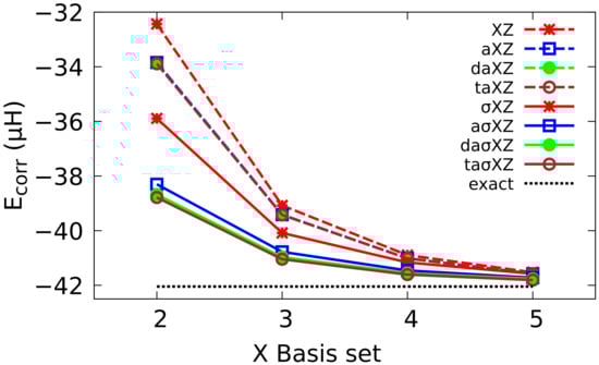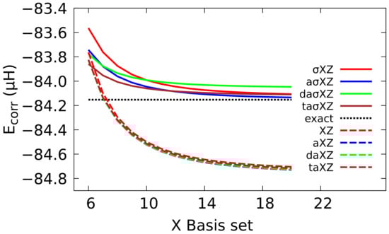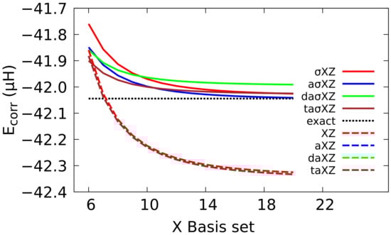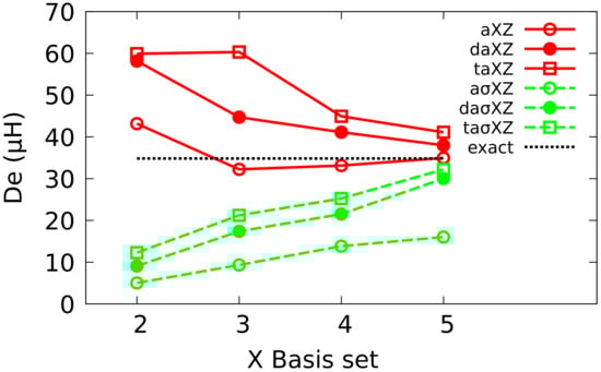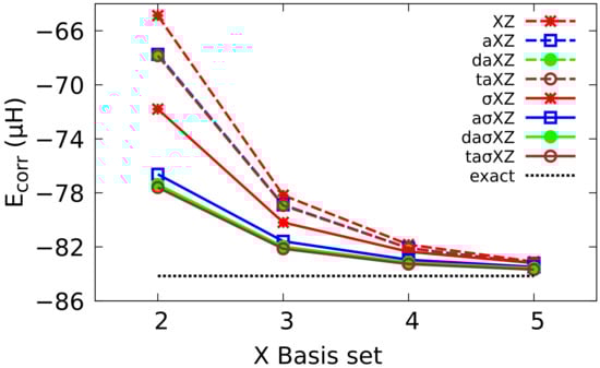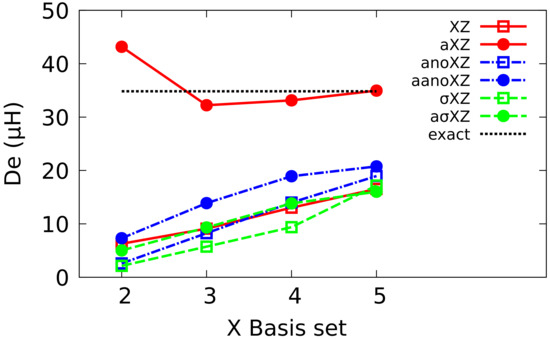 The better performance of BS over Dunning BS is evident. CBS extrapolation yields a gain of at least two figures in the former, while scarcely one figure is gained in the latter. The case of aXZ is specially noticeable, as three figures are gained in the CBS extrapolation both in the atom and in the diatom. Furthermore, CBS extrapolation in Dunning BS lies below the exact value, whereas it converges to the right value in the case of BS. This behavior is clearly visible in Figure 7 and Figure 8.