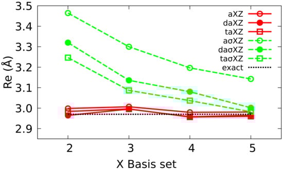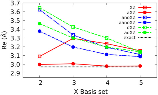 Regarding the dissociation energy, Figure 3 shows that in Dunning BS, the inclusion of new polarization functions in the sequence aXZ, daXZ, taXZ tends to worsen the results, whereas in BS, a regular improvement in the value of is observed. In the case of equilibrium distance, , Dunning BS produce results closer to the exact than those of BS, but the results attained with the latter also exhibit a regular approach to the right value, as shown in Figure 4.
