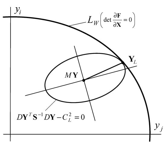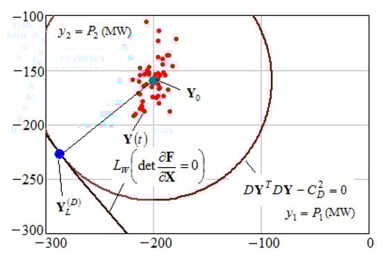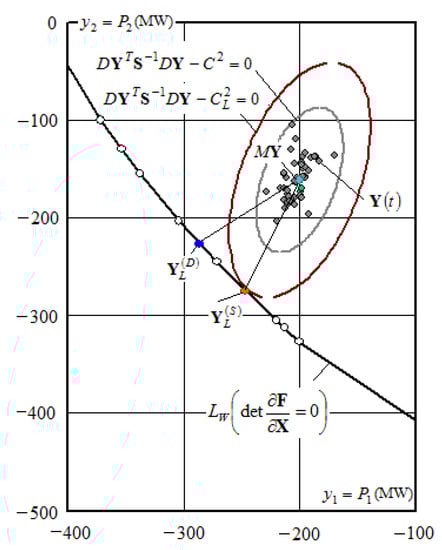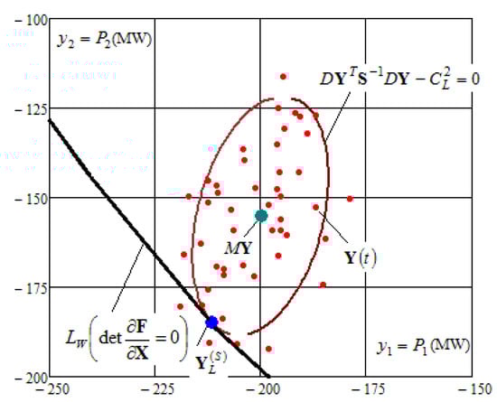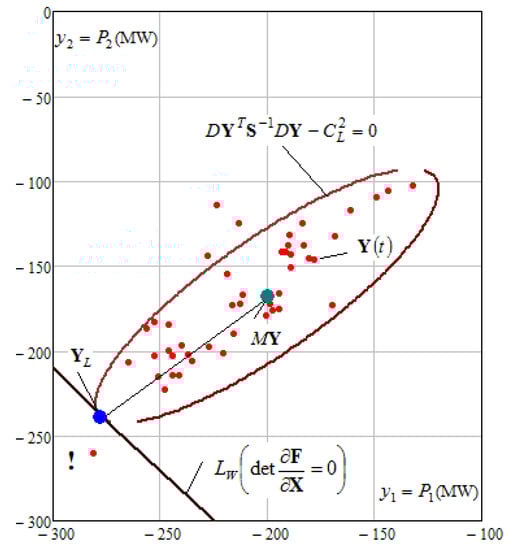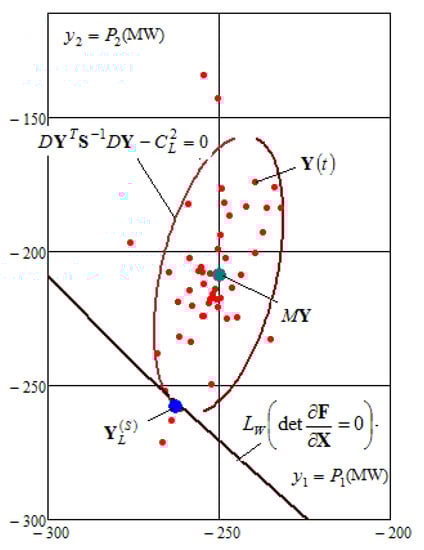 With the center at the point does not have common points with the hypersurface . Here ; denotes mathematical expectation; is a covariance matrix; is a value that determines the probability of finding the parameters of Y inside the hyperellipsoid (3). The covariance matrix S participating in (3) can be found using known methods for assessing the state of the PSS [26].