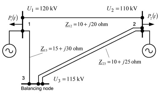 As an example, below are the results of determining the stability margins for a three-node EPS model shown in Figure 2. The model corresponds to a 110 kV network supplying two load nodes equipped with distributed generation (DG) plants with a rated power of 50 MW. Automatic regulators of DG plants provide voltage stabilization on 110 kV busbars. Figure 3 shows the graphs of the power injection changes