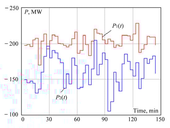 where are consumer loads with a random time law; —capacities of generators of the DG plants, which are assumed to be constant; k = 1, 2.