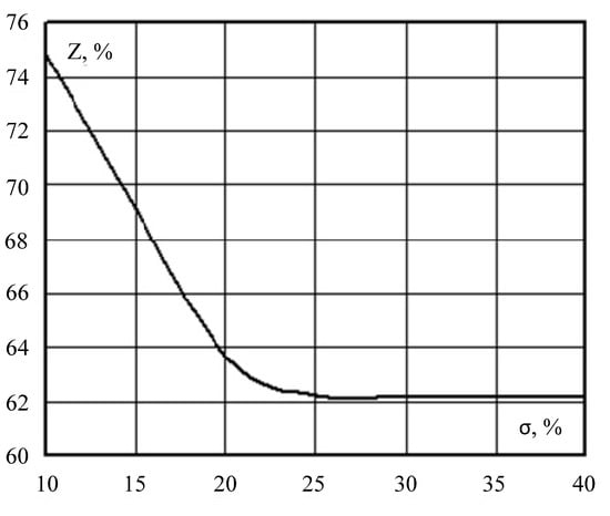 Table 1 presents simulation results obtained on the basis of an experimental code implemented in Mathcad. Figure 4, Figure 5, Figure 6, Figure 7, Figure 8, Figure 9 and Figure 10 provide the corresponding illustrations. Table 1 shows the values of the parameters , characterizing the limiting modes obtained at different values of the standard deviation of the consumer load graphs. In addition, Table 1 provides values of corresponding to hyperellipsoid (3), and the values that determine the probabilistic risk assessments of the SAS loss.