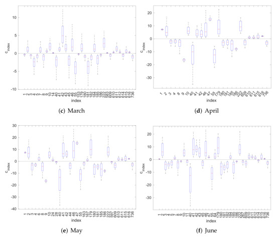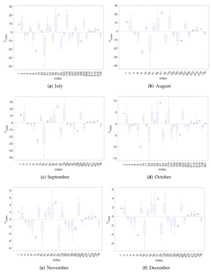 In Figure 3 and Figure 4, we use box-plots to represent the posterior density estimates of the PC coefficients generated by the Gibbs sampler. In these figures, we consider only the coefficients corresponding to bases characterized as significant according to the MPM rule; namely, those with . We observe that significant coefficients do not include zero in the range where the main posterior mass is concentrated. This shows that the method is consistent. Moreover, we observe that the significant PC coefficients that correspond to the period May-August have, in general, larger absolute values. This indicates that the variance of the output LH during those months is larger compared to that of the rest months, which is as expected. Finally, we can possibly infer that different input parameters may have a different effect of LH at different times, since we can observe different significant coefficients, or bases, in different months.