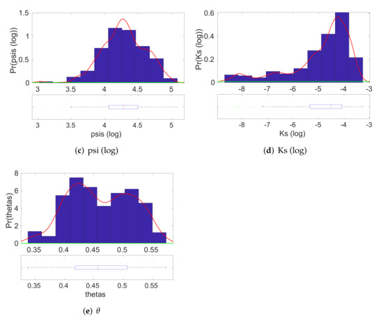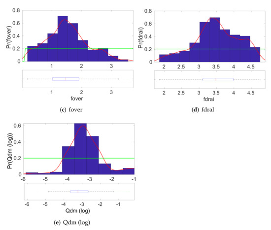 In Figure 5 and Figure 6, we present the estimated posterior densities of the input parameters of CLM4, as generated by the MCMC sampler. The blue bars correspond to the histogram estimate, whereas the red line corresponds to the kernel density estimate. These posterior distributions allow us to find a reasonable range of input values that correspond to the given value of output . The associated box-plots of the marginal posteriors of the model parameters at each individual figure indicate the range of the main posterior density. We can see that we have successfully managed to shorten the ranges of the possible values for most of the input model parameters. For instance, we observe that the main density on the marginal posterior distribution of the density of Qdm is around the area in scale.