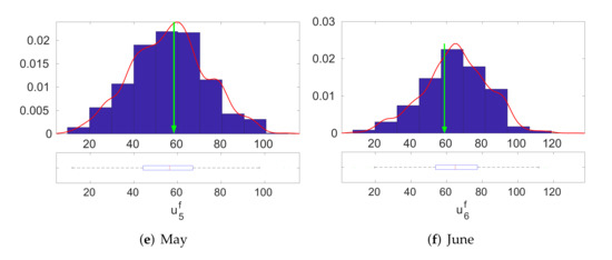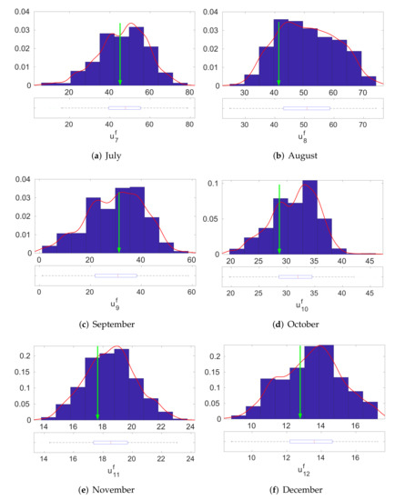 We validated the effectiveness of the Bayesian inversion procedure. We evaluated the predictive distribution of the output parameter LH by using the derived gPC surrogate model and the MCMC sample of the input parameters generated by Algorithm 1. In Figure 7 and Figure 8, we present the resultant predictive distributions of the output LH for the 12 months. The blue bars are the histogram estimate, the red line is the kernel density estimate of the predictive distribution, and the green arrow represents the observed output value of LH. The plots show that, for each month, the observed output value for the LH lies below the modes of each of the marginal predictive distributions. This implies that the proposed methodology is valid and that the surrogate model derived from the method is able to produce accurate predictions.