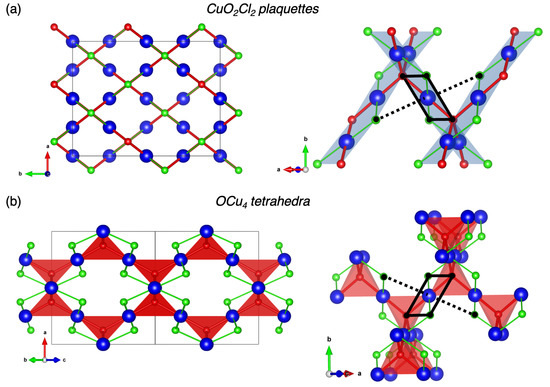 The melanothallite Cu2OCl2 crystallizes in the orthorhombic space group with a = 7.4477 Å, b = 9.5989 Å, c = 9.6888 Å, V = 692.65 , and Z = 8 [11]. The structure shown in Figure 1a is characterized by one symmetrically non-equivalent Cu2+ site located in a strongly distorted octahedral environment due to a Jahn–Teller effect. It can be viewed as a CuO2Cl2 square-planar environment (also called plaquette), in which the bond lengths are = 1.943 Å and = 2.283 Å. Two longer bonds are formed with chlorine ions in apical positions with = 3.123 Å. These CuO2Cl2 plaquettes are sharing edges to form ribbons which are inter-connected together by the oxygen ions in a three-dimensional network, which has many common features with the CuO atomic structure. For instance, both Cu2OCl2 and CuO [23,24,25] exhibit unusual thermal variations of lattice parameters due to the so-called hinge mechanism [26]. The ribbons are parallel to the and directions. As shown in Figure 1b, another vision of the structure is a pyrochlore-like lattice where the tridimensional network is based on O-centered OCu4 tetrahedra which are sharing corners. Here, the chlorine species are pointing toward the center of cavities.