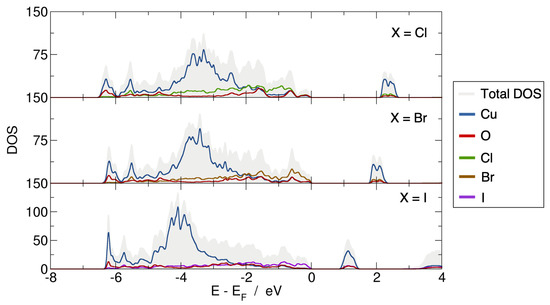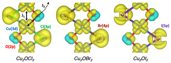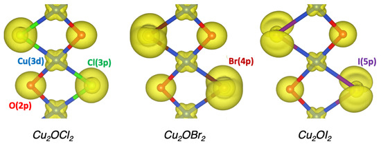 Based on the optimized structures, the electronic properties were investigated using the Wien2K code. The projected density of states (pDOS) of the three Cu2OX2 systems are represented in Figure 2. The present PBE0 calculations lead to band gap values of 2.18 eV, 1.85 eV and 0.95 eV for X = Cl, Br and I, respectively, and rather similar pDOS. The valence band (VB) is based on the O-2p, Cl-3p (or Br-4p or I-5p) and Cu-3d states (from −7 to 0 eV with respect to ). While the top of the VB is mainly composed of O-2p states in Cu2OCl2, it is mainly based on Br-4p and I-5p states in Cu2OBr2 and Cu2OI2, respectively. Such a point is emphasized in Figure 3 by the electronic densities calculated in the energy range from −0.5 to 0 eV (with respect to ). The magnetically active orbital, i.e., the one carrying the magnetic moment, is the Cu-3, as expected from the electronic configuration and the square planar environment. The calculated magnetic moment of copper is 0.6–0.7 in Cu2OX2, which is in good agreement with the available experimental data for Cu2OCl2. Indeed, the ordered magnetic moment was found to be 0.64(5) and 0.66(2) from powder and single-crystal neutron refinements, respectively [13].