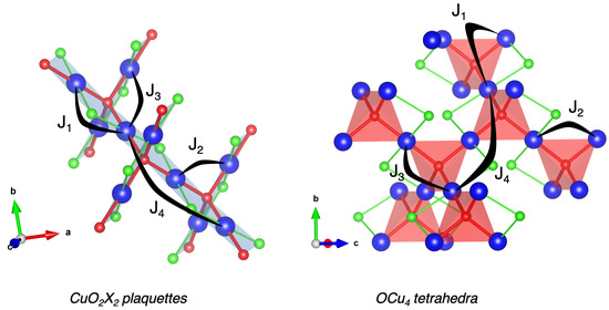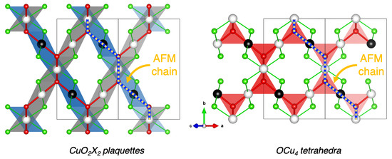 Interestingly, these three systems can be compared to their parent compound CuO, for which the atomic and magnetic structures are described using different descriptors. While the atomic structure can be viewed as based on ribbons of edge-sharing CuO4 plaquettes, the magnetic order is mainly governed by AFM spin chains of corner-sharing CuO4 plaquettes. Here also, it appears that the strongest magnetic coupling, i.e., , is at the origin of AFM spin chains of corner-sharing CuO2X2 plaquettes, highlighted by a yellow–blue dotted line in Figure 5. The presence of such AFM spin chains can be more clearly seen and understood in the OCu4-based vision, where these AFM spin chains propagate along tetrahedra.