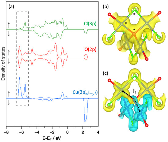 To go further, we focused more deeply on the magnetically active orbital, i.e., Cu-3, and its interaction with the surrounding ligands. The spin-polarized pDOS of Cu-3, O-2p and Cl-3p states of one plaquette are given in Figure 7a for Cu2OCl2. It appears that the occupied Cu-3 states are mainly positioned within the energy range from −7 to −5 eV (highlighted by the gray dotted line rectangle). The electronic charge density () and spin density related to this energy window are shown in Figure 7b,c, respectively. First of all, from the analysis of both pDOS and , it appears that the Cu-3 orbital interaction is larger with O-2p than Cl-3p states. It confirms that the magnetic moment of the magnetically active orbital is mainly mediated by oxygen atoms and thus justifies that the largest coupling is along a Cu-O-Cu superexchange path. In addition, the up- and down-pDOS of O-2p states are perfectly symmetric, leading to a net magnetic moment of zero. Similarly, the spin-density around oxygen is constituted of two equivalent lobes with opposite spins (as previously discussed). Looking in more detail, Figure 7c evidenced the pivotal role of oxygen that connects two ribbons (with opposite spins), which are nearly perpendicular. To summarize the results of the present analysis, the magnetically active orbital results from an overlap of Cu-3 with O-2p and to a less extent with Cl-3p states in Cu2OCl2. One may notice that in this energy range, the pDOS of the magnetically active orbital is constituted by two peaks: (1) the lower in energy originating from the Cu-O interaction, while (2) the higher in energy is associated to the Cu-Cl interaction. A similar picture can be retrieved for Cu2OBr2 and Cu2OI2, except that the first peak (Cu-O interaction) increases and the second peak (Cu-X interaction) decreases (see Figure 2). This observation explains the enhancement of from Cu2OCl2 to Cu2OBr2 and to Cu2OI2.