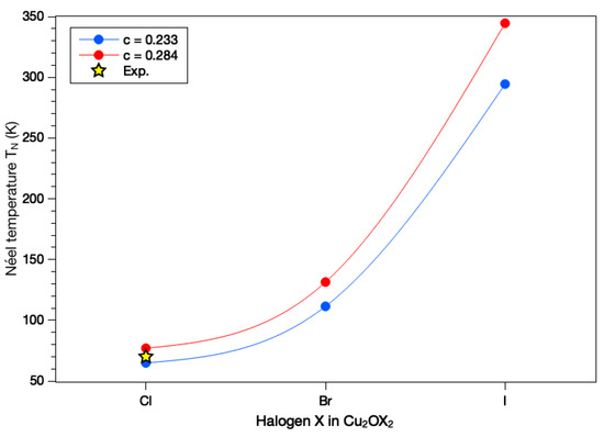Using the aforementioned J values and the original c and parameters, we obtain = 65, 111 and 294 K for Cu2OCl2, Cu2OBr2 and Cu2OI2, respectively (see Figure 8). Experimentally, 70 K for Cu2OCl2. Such a good agreement validates the present magnetic model, which consists of considering AFM spin chains based on interacting through an effective coupling defined as . It should be noticed that if we use the refined value for CuO c = 0.284 [3], we obtain = 77, 131 and 344 K for Cu2OCl2, Cu2OBr2 and Cu2OI2, respectively (see Figure 8). The agreement for Cu2OCl2 is still very good with the experiment, and whatever the c value is, we predict a significant increase of when Cl is replaced by either Br or I in the compound. A similar trend has been reported experimentally for CuCl2 and CuBr2 [6,7], for which = 23.9 and 77 K, respectively.