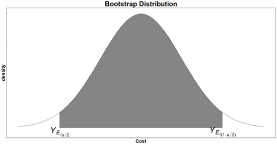 In Equation (2), represents the prescribed probability level, whereas and are the lower and upper bounds corresponding to the -th and the -th percentiles of the bootstrap distribution for project under consideration, respectively (Figure 1).