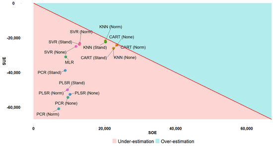 In parallel to the evaluation of the above loss functions, visualization techniques can also be applied for extracting valuable information regarding specific aspects of prediction capabilities. Regarding this, the construction of the Regression Receiver Operating Curves (RROC) space [47] provides evidence about the proneness of a POE to systematically under- or over-estimate the actual cost value. More specifically, the performance of a POE is graphically displayed on a two-dimensional plot, namely the RROC space, where the horizontal and the vertical axes represent the sum of overestimation ( = ) and the sum of underestimation ( = ), respectively, for a given set of projects [47].
