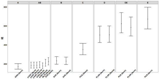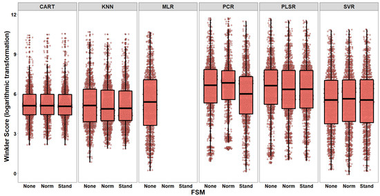 Thirdly, the two common performance metrics (coverage and width) that are used for the quality assessment of statistical and ML models in terms of uncertainty may not be informative for decision-making purposes. For example, the CART (Norm) model presented the highest coverage probability percentage () but with a cost of extremely wide intervals as expressed by the highest median width value (). Thus, composite loss functions (e.g., the Winkler score) combining information about the ability of a model to incorporate the actual cost value within a practical range of bounds should be used by the practitioners in order to derive meaningful conclusions regarding the performances of interval estimators.