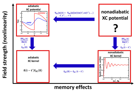 Schematic representation of approximations for the nonadiabatic XC potential for strongly correlated materials in the cases of different strengths of the external perturbation (nonlinearity) and different levels of importance of the memory effects. The approximated potentials (the two left and the right-bottom boxes) are obtained with DMFT. The general structure of the exact nonadiabatic XC potential (top right box) is not known.