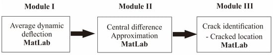 The proposed crack-identification method consists of three main modules: dynamic deflection module, central difference approximation calculation module, and crack-identification module. The first module determines the average dynamic deflection (vertical displacement) of every point (node) on the beam. The second module takes this set of deflection values as input and processes them into a set of central difference approximation values of every point on the beam. Finally, this set of central difference approximation values is inputted into the crack-identification module and processed, the output of which will be a graph of magnitude of central difference approximation at every point (node) of the beam. A sharp peak at any point in this graph indicates a crack at that point. All three modules were manually MATLAB-coded by the author. The flow diagram of the operations of these main modules is illustrated in Figure 1 below.