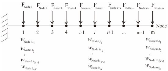 The first module is the dynamic deflection module, consisting of two steps. In the first step, from a specified velocity of the moving load parameter, external force acting on each specified node —1, 2, 3, …, m—as shown in Figure 2, this module determines the time step and the total number of time steps for average displacement calculation.