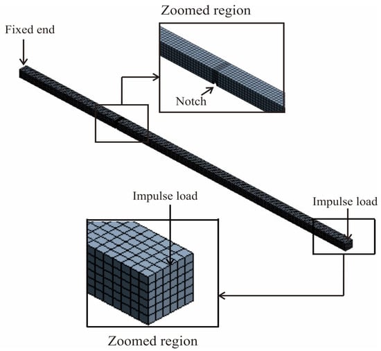 - FE Model Creation (Meshing): Mesh generation is a process of dividing the structure continuum into a number of discrete parts or finite elements. In this study, the uncracked beam was assigned a total number of FE elements of 4620 and the total number of nodes of 24,768. For the cracked beam, the total number of elements was the same, at 4620, but the number of nodes were higher, at 2.4803, because a higher number of meshes were assigned at the crack region to model it more precisely. The meshes were constructed using 232 rows of elements along the length of the beam, six rows of elements across the width, and four rows of elements through its depth or thickness. The maximum size of a mesh was 0.25 mm. The boundary condition for one end of the beam was that it was fixed to a location in the environment, while the boundary condition for the other end was that it could move freely in response to various forces acting on it. The illustration of the meshed FE model of the cracked beam is shown in Figure 4.