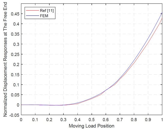 To check the validity of the forced vibration behavior of a cracked cantilever beam under moving load calculated by FEA, the results from FEA analysis were verified against such behavior calculated by Hai-Ping Lin and Shun-Chang Chang’s exact method. The graphs of the results from both methods were overlayed on top of the other in Figure 8. It can be clearly observed that in the range of position from 0–0.7 beam length, the two graphs almost coincided, while they did not deviate more than 5% in the range of position from 0.7–0.9 beam length. Therefore, it can be concluded that the beam vibrational behavior was modeled sufficiently precisely for crack identification by the proposed crack-identification method.