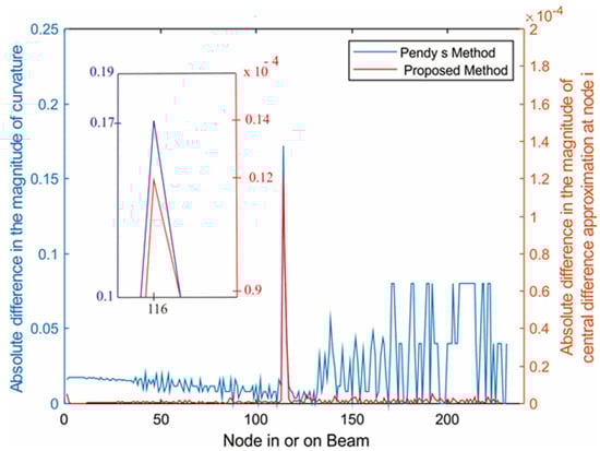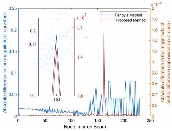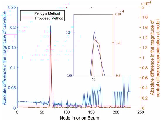 We assigned a crack to be at one-third, the middle, and two-thirds of beam length and identified their locations. Then, we did the same but using the proposed method and compared the results. Figure 6, Figure 7 and Figure 8 show plots (with 10−4 scaling) of three crack locations identified by the proposed method (for which a moving load of 70 N was applied) overlayed on plots of the three crack locations identified by Pendy’s curvature mode shape method.