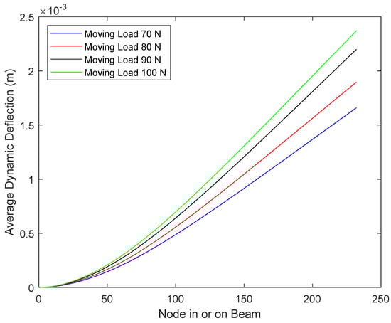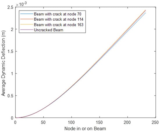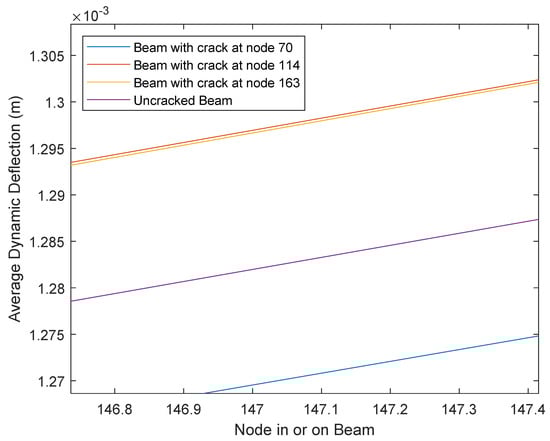 Average dynamic deflection of cracked and uncracked beam under a 100 N moving load.