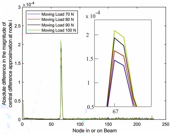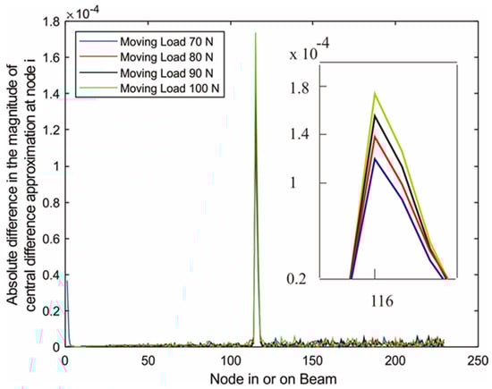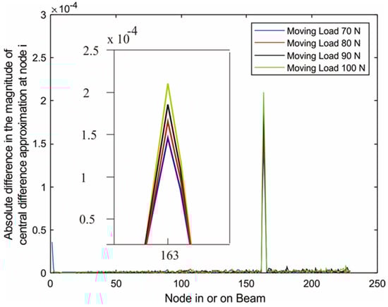 Figure 14, Figure 15 and Figure 16 illustrate the results obtained from the absolute difference in the central difference approximation of displacement at a node of a cracked beam and an uncracked beam, evaluated by Equation (3), at each of three wedge-shaped notch locations: a notch (or a crack) at x1/l = 0.3; a notch at mid-span of the beam; and a notch at x1/l = 0.75. The notch depth was 30% of the beam thickness. It can be observed that for all notch locations, varying the moving load from 70 N to 100 N still provided clearly distinguishable peaks at the same notch location, though a load of 100 N provided the highest peak because it caused more deflection or displacement.