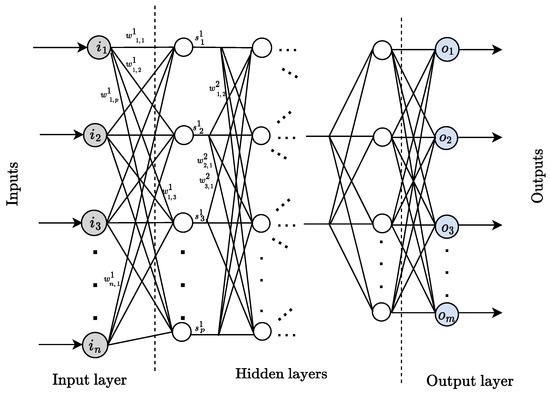 Each layer performs a function from the inputs (or the outputs of the previous layer) to the outputs, using activation functions defined in each unit and the value of the weight of the connections. For example, a network with three layers defines functions