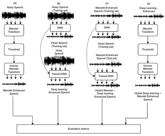 As in the case of wavelets, objective measures can be applied to validate the benefits of the deep neural networks in each noise type and level. With the purpose of performing a proper comparison, the same amount of epochs for training the deep neural networks was used for both (noisy, clean) and (wavelet-denoised, clean) procedures. Additionally, for the sake of completeness in the experiments, we also considered a two-stage approach with the application of wavelet denoising to the results of the deep-learning-based denoising procedure. This experimental approach can be summarized in four possibilities to implement and compare, as illustrated in