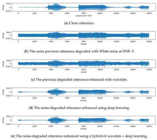 Table 1. A first relevant result can be observed on the small benefit that was measured for the case of the wavelet enhancement. A better performance than those of the wavelets was obtained with the deep learning enhancement for every SNR level of Babble noise. In terms of the hybrid combination of wavelets and deep learning, the deep neural networks as a second stage achieved an improvement in three of the five cases of PESQ. Furthermore, an increase on SegSNR was measured in two of the five cases with the same hybrid combination, as presented in