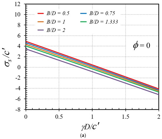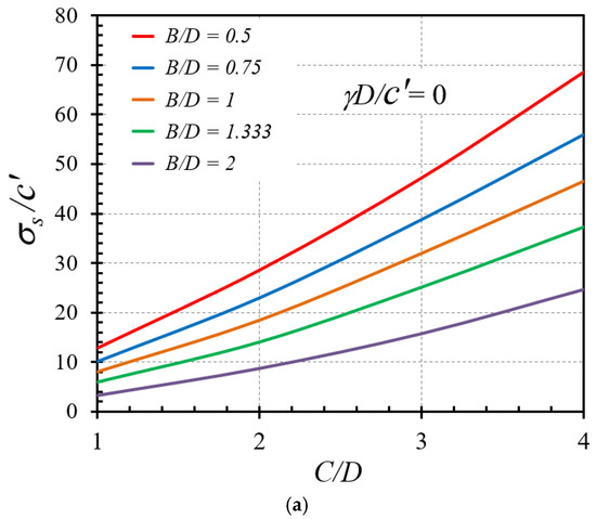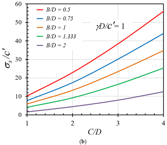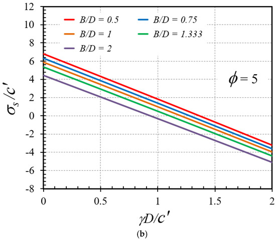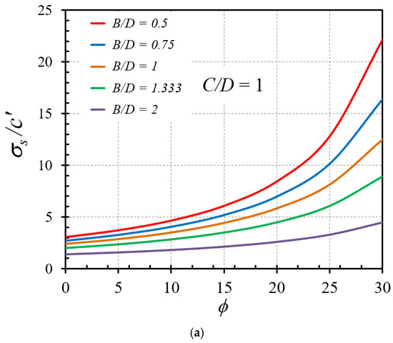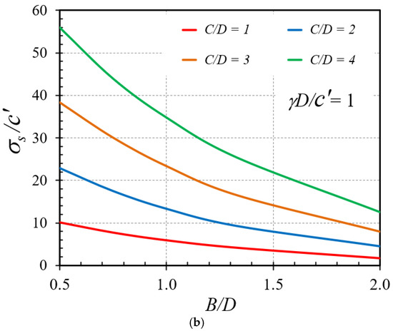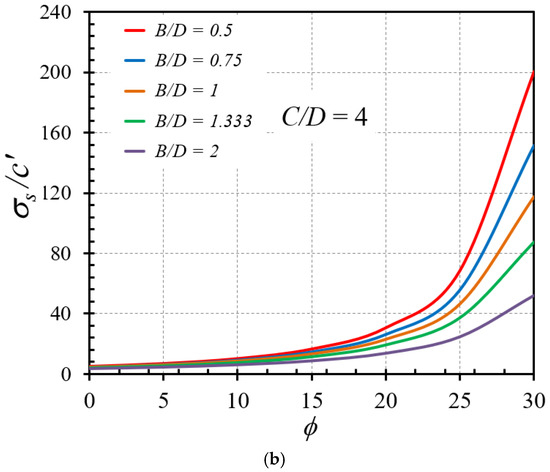 Throughout all numerical results, Figure 3a,b represents the influence of the soil friction angle on the stability factor in the selected cases of γD/c′ = 0 and C/D = 1 and 4, respectively, with various values of B/D = 0.5, 0.75, 1, 1.333, and 2. A non-linear increasing relationship between ϕ on σs/c′ is discovered, in other words as the soil frictional angle increases, the strength of soil around the tunnel also increases. The influences of the overburden factor γD/c′ on the stability number σs/c′ with the selected cases of C/D = 0 and ϕ = 0° and 5 are shown in Figure 4a,b, respectively. A decreasing linear relationship is found, with an increase in γD/c′ leading to a decrease in σs/c′. Figure 5a,b demonstrates the trend of the cover-depth ratio C/D on the stability factor σs/c′ for ϕ = 25° and γD/c′ = 0 and 1, respectively. A nonlinear rising relationship is observed, with an increase in C/D resulting in an increase in σs/c′. Moreover, the influence of the width-depth ratio B/D on the stability factors σs/c′ of horseshoe tunnels with ϕ = 25° and γD/c′ = 0 and 1 is investigated and displayed in Figure 6a,b. The charts include four distinct values of C/D = 1, 2, 3, and 4. It is discovered that a nonlinear decreasing relationship occurs, implying that higher B/D values result in a lower stability factor σs/c′.