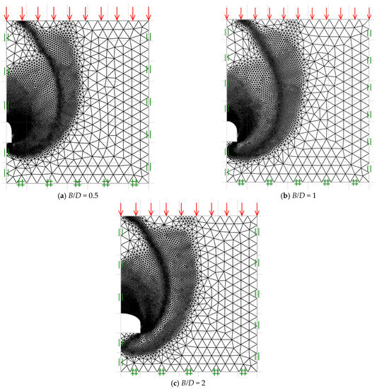 Final adaptive meshes for various B/D (C/D = 5, γD/c′= 0 and ϕ = 25°).