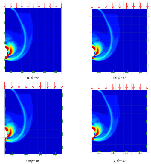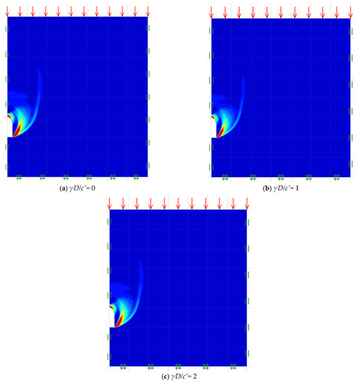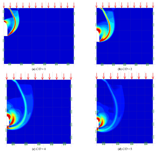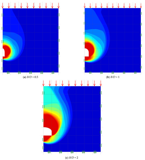 The adaptive meshes concept is finally utilized to monitor the failure mechanisms of unlined horseshoe tunnels in cohesive-frictional soil. Figure 7a–c illustrates samples of final adaptive meshes for the selected values C/D = 5, γD/c′ = 0, and ϕ = 25° with varying values of B/D = 0.5, 1, and 2. More details are described earlier. In addition, the influence of analyzed parameters such as γD/c′, C/D, B/D, and ϕ on the horseshoe tunnel failure mechanisms are explored and demonstrated in Figure 8, Figure 9, Figure 10, Figure 11 and Figure 12. The illustrated failure mechanisms are related to the shear dissipations of unlined horseshoe tunnels in cohesive-frictional soil. Figure 8a–c, for varied values of B/D = 0.5, 1, and 2, clearly indicates that the failure zone extent gets larger and higher off the ground surface as the tunnel gets wider (higher B/D). In Figure 9a–d and Figure 10a–d, it seems like the soil frictional angle of the overburden factor does not have much influence on the failure mechanisms for the case of the narrow tunnel as well as the overburden factor. Figure 11a–d illustrates the influence of the cover-depth ratio on the failure mechanisms. The failure zone appears to extend in both vertical and horizontal planes as the tunnel is placed deeper (higher C/D). Thus, the deeper the tunnel, the greater the failure zone. In all figures, the type of failure mechanism of the horseshoe tunnel is mostly unchanged, resembling a half-spiral opening failure.