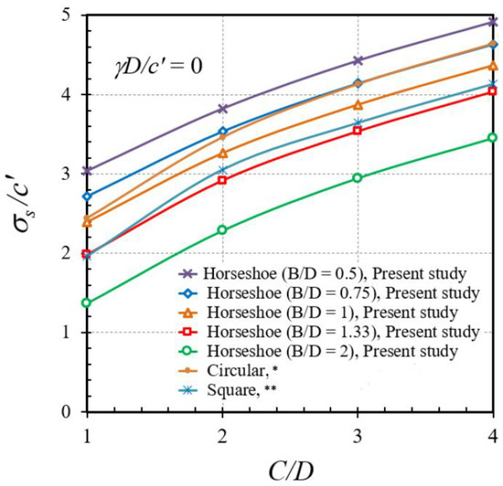 Comparison of the stability factors σs/c′ for different shapes of tunnels (ϕ = 0°). * Yamamoto et al. [19], ** Yamamoto et al. [20].