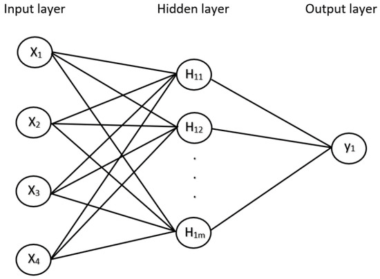 ANN comprises three layers: an input layer, a hidden layer, and an output layer, as shown in Figure 13. In this study, the input layer consists of four nodes representing C/D, B/D, γD/c′, and ϕ. The second layer is the hidden layer, consisting of one or more threshold logic unit layers. Generally, the number of hidden layers and hidden neurons is chosen via the trial-and-error method. It is generally recommended to start from one hidden layer. The number of hidden neurons is varied from one to the number that can create the proper model with high accuracy. This layer aims to convert the information into content that the output layer can use to predict the data. It is within this layer that the weighted sums of the inputs are calculated and a step function is applied to them before they are sent off as an output through the use of the rectified linear unit (ReLU) activation function, which provides nonlinearity in the network. The final layer is the output layer presenting the dependent variables. In this paper, the output layer consists of one node, which is a predicted stability factor of shallow elliptical tunnels in cohesive-frictional soils.