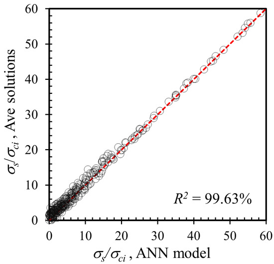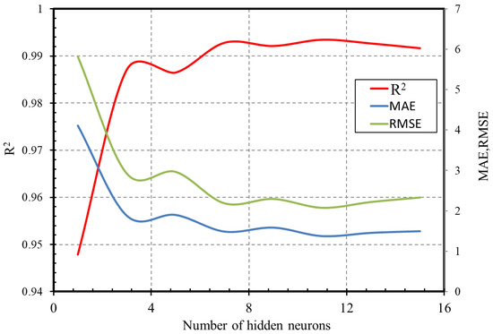 In this study, the number of ANN modes is developed considering different numbers of neurons in the hidden layer. The performance of the models against the number of hidden neurons is plotted in Figure 14. It can be seen that after reaching a certain number of neurons, the performance of ANN models is likely to stabilize. In this study, ANN with the architecture of 4-7-1 is selected to be the best ANN model, as it shows the highest accuracy and the lowest errors compared to other models. Figure 15 compares the results obtained by the FELA solution and the ANN model. It is found that the predicted values from ANN are in agreement with those from the FELA solution. Table 3 also compares the performances of the MLR and ANN models. It is clear that the ANN model performs much better than the MLR model.