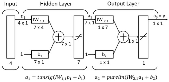 Figure 16 presents the multilayer network with the dimensions of input, weight, bias, and the output matrices of the proposed ANN model for stability evaluation of shallow horseshoe tunnels. From Figure 16, IW1 and IW2 represent the hidden weight matrix and output weight matrix, respectively, and b1 and b2 represent the bias matrices in the hidden and output layers.