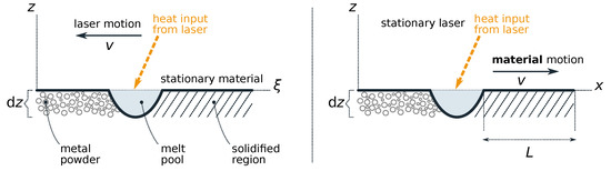 Consider the L-PBF process operating in a straight line. The laser scans toward the left, at a constant speed v, see Figure 2. By Galilean relativity, we consider the laser as remaining stationary, and the material as moving toward the right, at the same constant speed v. This allows us to apply the mixed Lagrangean–Eulearian formulation of axially moving materials [19]. We first consider the general dynamic situation, and then specialize to a steady state for the Eulerian observer.