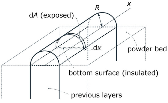 The SI unit of the heat source is , so the unit of r in (15) must be . However, a standard heat transfer coefficient, which we denote by , across a surface has the unit . To relate r to the standard format, as an example, let us consider the printed layer to have a semi-circular cross section with radius R, with the round part exposed to air.