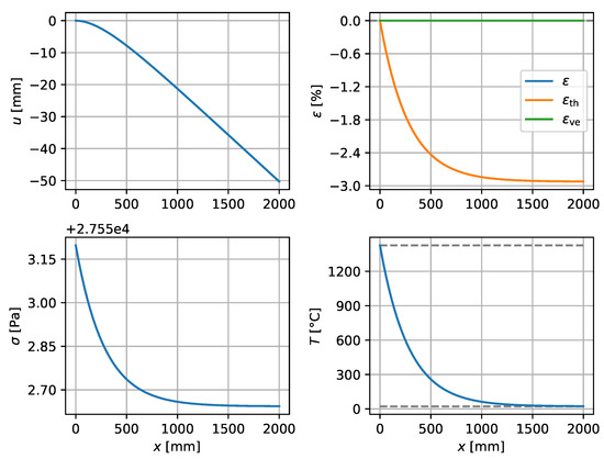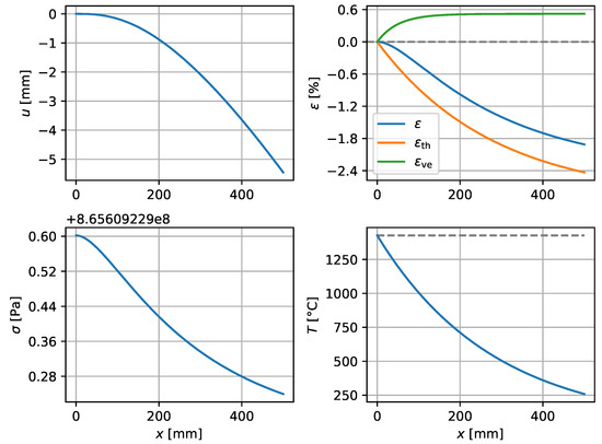 Figure 4 presents the results for 316L steel. As is seen in the figure, the total strain saturates at . Almost all of this is thermal shrinkage; the viscoelastic strain saturates at (note exponent). The viscoelastic strain is tensile, while the thermal and total strains are compressive. At the lower left subfigure displaying the stress, note the range of ; stress is generated only by the viscoelastic strain. The maximum stress is (positive, tensile) at , and the stress varies across the domain from this value by less than one pascal. In the lower right subfigure displaying the temperature, the upper marked temperature is the melting point at ; the lower marked temperature is the temperature of the environment at .