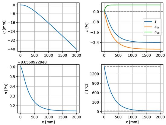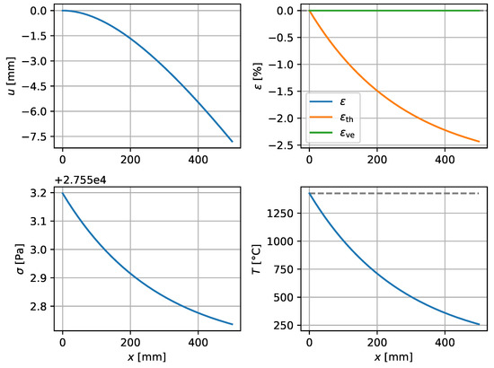 Figure 6 and Figure 7 similarly show the behavior of the model at an artificially high viscosity, for comparison. The material is otherwise exactly like 316L steel, but with viscosity significantly increased to have a Kelvin–Voigt retardation time of , which is approximately times higher than for steel. The temperature field remains the same as for 316L steel. Now the viscoelastic strains saturate at , , and . As before, the viscoelastic strain is tensile, while the thermal and total strains are compressive. The stress level is now high; , but the variation in the stress across the domain still remains at less than one pascal. This indicates that the almost constant stress predicted for 316L steel cannot be due to the short retardation time of the material.