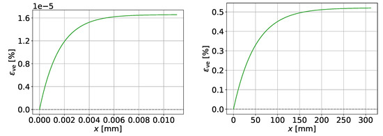 Figure 8 shows the viscoelastic strain, which causes the stress. With the parameters used in our examples, for 316L steel, the viscoelastic strain saturates at approximately (note scale), whereas in the artificially viscous example, saturation is reached at approximately . At , these correspond to a saturation time of and , respectively. These differ by a factor of 30,000, as expected for a Kelvin–Voigt material, given the ratio of the retardation times.