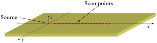 Various scanning techniques (laser Doppler vibrometry, phased arrays, air-coupled transducers) can be applied to obtaining data in the form of B-scans, which is necessary for data extraction in the first step. Let us consider an elastic plate, where the Cartesian coordinates are introduced so that the scan line goes along the axis, and the source exciting GWs is situated at the origin (Figure 1). Further on, it is assumed that the laser Doppler vibrometry is employed as a method for data acquisition at the surface of the specimen, since it provides minimal distortion to the measured wavesignals [27] (out-of-plane velocities or displacements).
