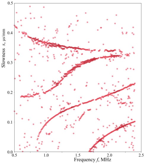 Here, is the total number of frequencies in the set . Further, the points with amplitudes are removed from the dataset to clean up the noise. It should be noted that the increase in this threshold of 0.1 leads not only to the removal of the noise but also deletes the points belonging to the dispersion curves themselves (it could lead to the full disappearance of some modes that have not been intensively excited in the experiment). Such a noise removal gives the set of slowness–frequency pairs