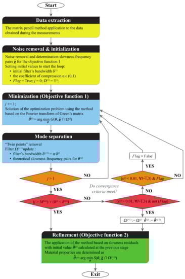 The method proposed here is a combination of two approaches for material-properties identification, for which convergence and accuracy was demonstrated and analysed in [26]. The method based on the slowness residuals (SRM) is time-consuming, since it needs multiple calls for mode separation and search-root procedures. The computational time for the second method based on the calculation of the Fourier transform of Green’s matrix (GMM) is a hundred times smaller than for the SRM, whereas the computational time for one GMM call with 200 frequencies is ≈9 s on a laptop with Intel Core i3. The accuracy of the SRM is better (the GMM usually overestimates parameter values). All the stages of the proposed algorithm for waveguide-properties identification are briefly described in the flowchart shown in Figure 3, whereas a detailed description of the stages can be found in Section 2 and Section 3.