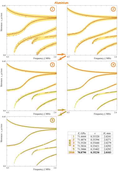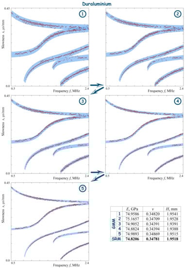 Figure 4, Figure 5 and Figure 6 exhibit experimental slownesses filtered during the iterative process of Step 2 for the three considered plates with the known mass density. All the five iterations of the first stage of the improved algorithm are illustrated in Figure 4, Figure 5 and Figure 6, to exhibit the filtering and stability of the method. In these figures, the work stages of the proposed algorithms are demonstrated. One can see that the quality of data is different for all the specimens. The experimental data for aluminium has the best quality, see Figure 4. The data for duraluminium, as clearly seen in Figure 5, is usually blurred, so that it is hard to distinguish between two chains of points. Curves for GW4 disappear at frequencies higher than 1.55 MHz, see Figure 6. One can see that the improved algorithm had no difficulties to complete the identification procedure. The parameter values for all the stages are shown in the table at the bottom of the figures. The solution of the optimization problems was implemented in the Python programming language, whereas the calculation of the Fourier transform of Green’s matrix and the search-root procedure was implemented in the FORTRAN programming language to speed up the computations. In [26], the SRM and the GMM were separately applied to the experimental data for the same aluminium plate, cf. Figure 4, and it was shown that the SRM provides more accurate results from a statistical point of view. The improved algorithm gives estimations of parameters for the aluminium sample, which are very close to the SRM in [26]. Though Step 2, where the GMM is used, already provides quite good estimations, the SRM at Step 3 improves the results of the identification procedure.