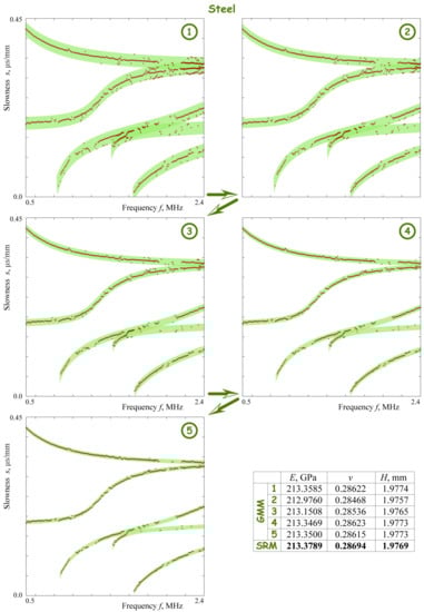 The proposed numerical method of material-properties identification allows for the processing of experimental line scans automatically with the minimal manual tuning of the parameters. In addition, its core functionality is not limited by the MPM as a tool for the evaluation of dispersion curves (i.e., the latter might be replaced by conventional wave-number frequency analysis [33] with further image processing to extract particular () pairs) and laser Doppler vibrometry as an experimental technique for UGW sensing (some other types of laser interferometers, as well as broad-band air-coupled transducers, could be adopted). Of course, the method might be improved by involving the parallel computing of (7) for various initial values at Step 3, which is the most computationally expensive part. Another extension might be related to the data extraction using the MPM, where adaptive schemes are possible to reduce noise and smooth dispersion curves.