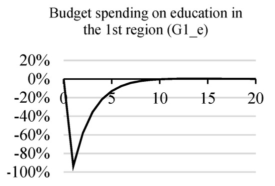 Secondly, it draws attention to the difference in the effects of budget purchases and investments in human capital. In the latter case, there is a negative impact on GRP (−0.27) and employment (−0.6). This is due to the fact that the redistribution of budget expenditures from current budget expenditures in favor of long-term ones creates a negative output gap in the short run, due to the fact that the effects of education are weaker in the short term than the effects of healthcare (0.1 vs. 0.3—see Table 1). Moreover, the positive impact on productivity results in lower demand for labor (−0.6) and investment (−1.3) in the short run. This is partly offset by an increase in real wages (0.3), which softens the decline in output. Thus, this scenario calculation clearly demonstrates the choice facing the authorities—the choice between short- and long-term development goals.